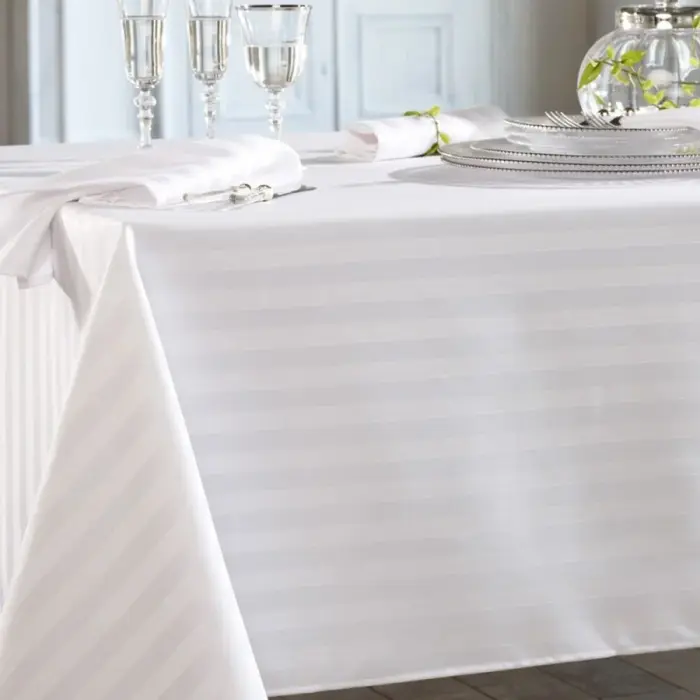 Aceasta fata de masa este confec ionata din damasc satinat cu dungi de 2 cm, este un produs deosebit ca aspect i calitate, ce ofera o atingere matasoasa.Dungile esute elegant n textura materialului ofera un aer sofisticat ce se adapteaza oricarui stil de interior.Reprezinta recomandarea noastra atat pentru casa dumneavoastra cat si pentru restaurante.Damascul sau bumbacul egiptean este versiunea de lux a bumbacului obi nuit, ce are un fir fin, o esatura densa de damasc, o stralucire matasoasa i o fine e aparte.