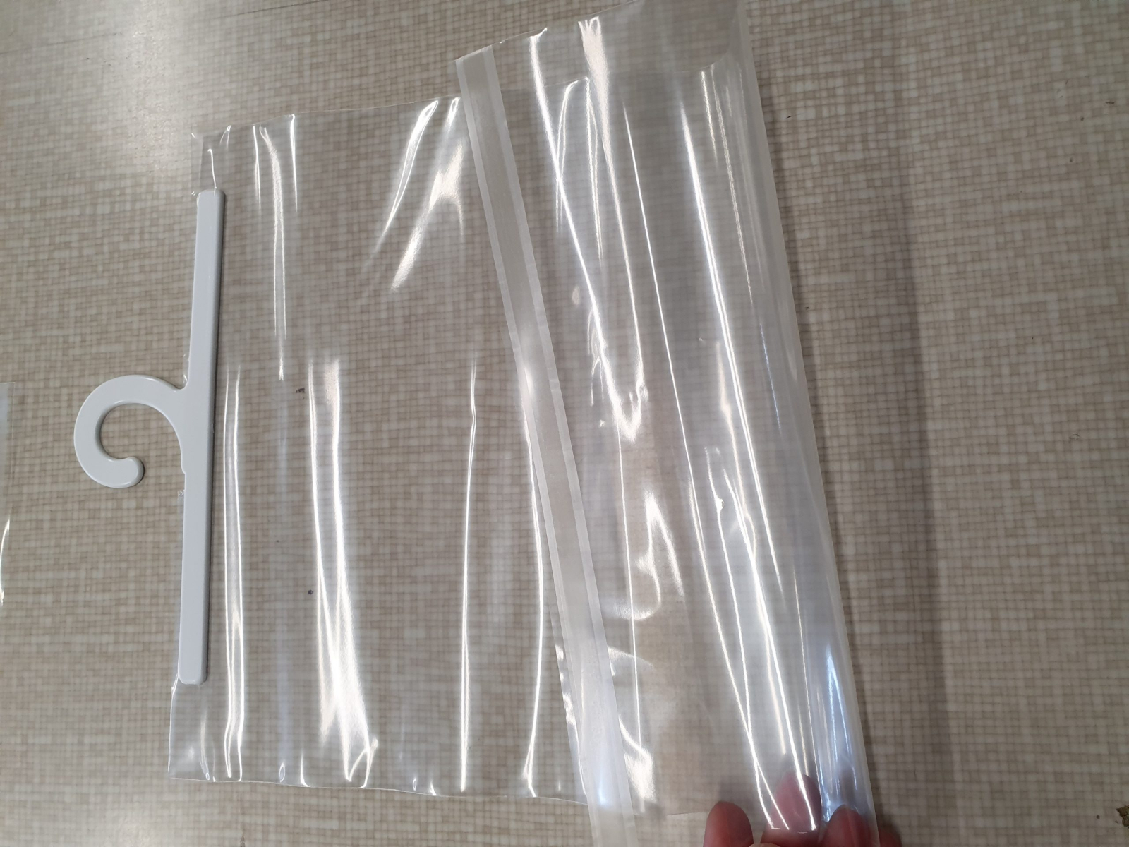 Punga polietilena cu adeziv si umeras se diferentiaza de pungile simple prin prezenta clapetei adezive si a umerasului, care permite inchiderea pungii pastrand forma rectangulara si au 2 gauri de aerisire. Adezivul clapetei este unul permanent, adica punga nu poate fi lipita si dezlipita de mai multe ori, ea de distruge la prima dezlipire.Transparen a pungii face ca produsele astfel ambalate sa poate fi prezentate la raft, dar le asigura i un grad de protec ie ridicat mpotriva prafului i murdariei, n timpul transportului i depozitarii.