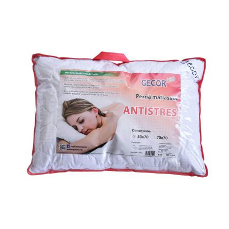 Perna este matlasata cu ata, avand fetele din microfibra care contine fire de carbon ce capteaza pe timpul somnului energia electrostatica asigurand un somn relaxant, comod si confortabil. Firele de carbon capteaza si indeparteaza surplusul de sarcina electrostatica asigurand un efect antistres.Umplutura este din puf siliconizat si este o fibra sintetica si elastica, cu grad mare de revenire la forma initiala dupa utilizare. Ofera sustinere fara agresiune a zonei cervicale. Este o perna pufoasa, antialergica, lavabila, ideala pentru folosirea intensiva