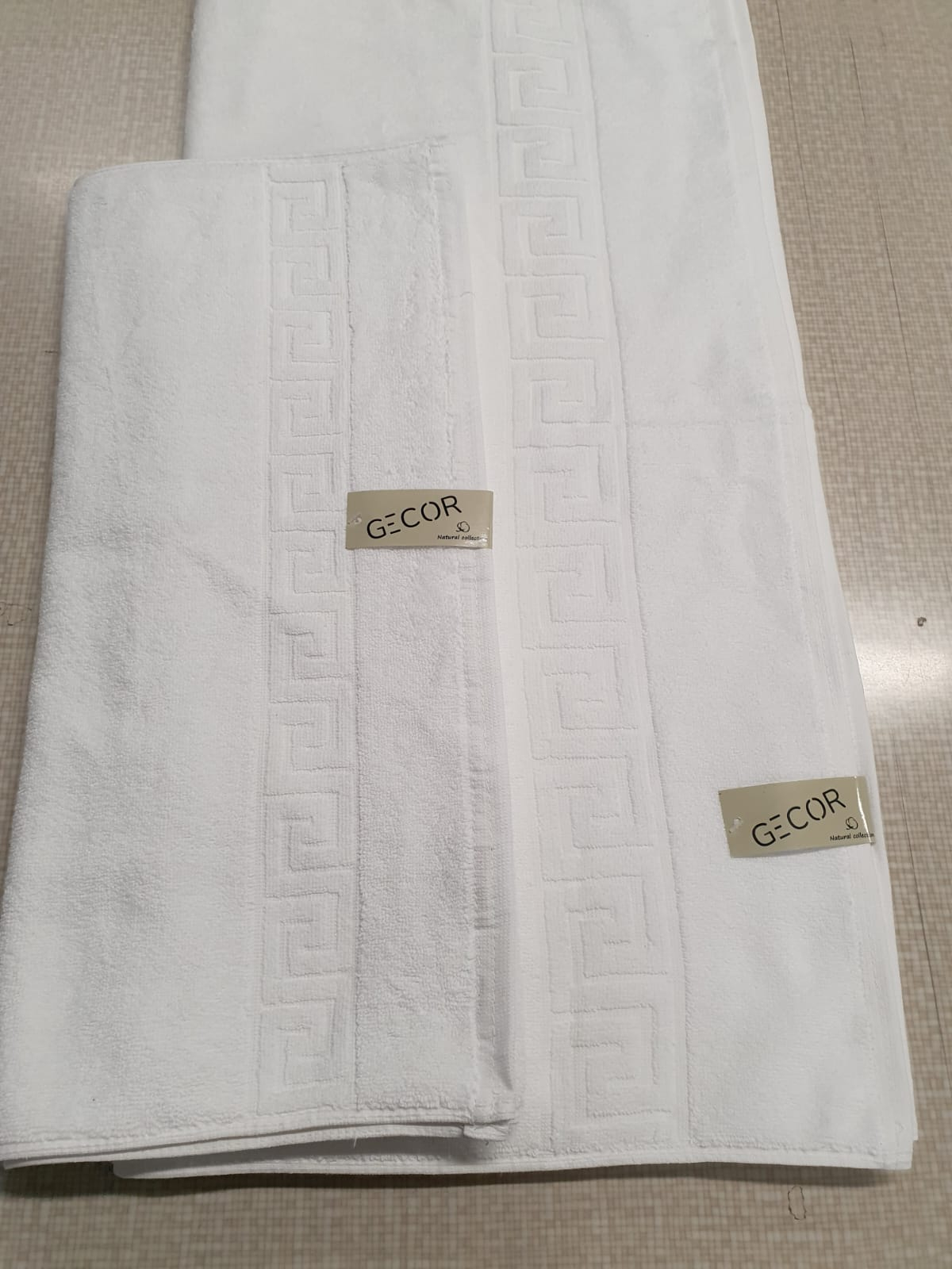 Prosop de baie model grecesc, bumbac 100%, Alb realizat cu o calitate premium de 650 gr/mp, greek border 100% bumbac pakistanez. Calitatea renumita a bumbacului pakistanez, de un alb optic imaculat, confera prosoapelor o capacitate de absorbtie mai mare, durabilitate si mai ales finete. Sinonim cu confortul si relaxarea, pe care fiecare isi doreste sa le aiba in casa. Prosoapele pe care le oferim spre comercializare sunt destinate uzului hotelier (industria Horeca).