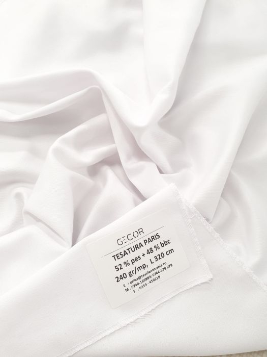 Tesatura alba fata de masa Paris este un material fin, are un aspect mat ceea ce-i confera eleganta, un grad ridicat de delicatete si moliciune la atingere precum si rezistenta la folosire si spalari repetate.Cel mai des va intalniti cu acest material la fete de masa si alte produse decorative.